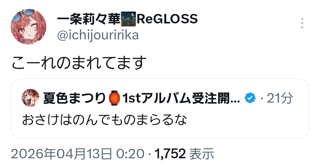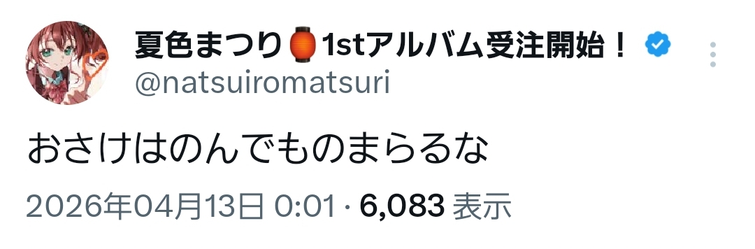 | … | 996無題Name名無し 26/04/13(月)00:34:24 IP:124.159.*(bbiq.jp)No.11862330+酒が入ったころさんは一段と愉快になる |