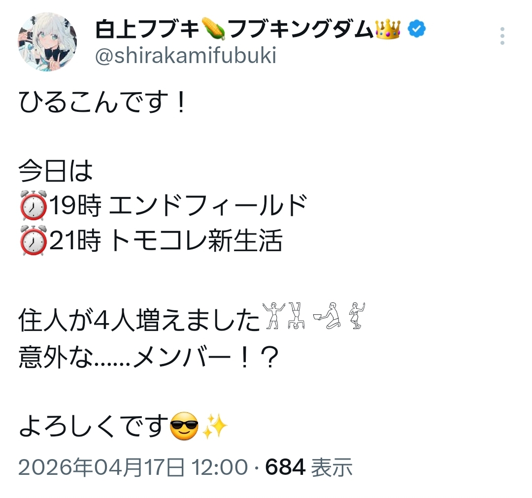 | … | 18無題Name名無し 26/04/17(金)11:06:05 IP:119.241.*(mesh.ad.jp)No.11879853+森さんのトモコレも始まる |