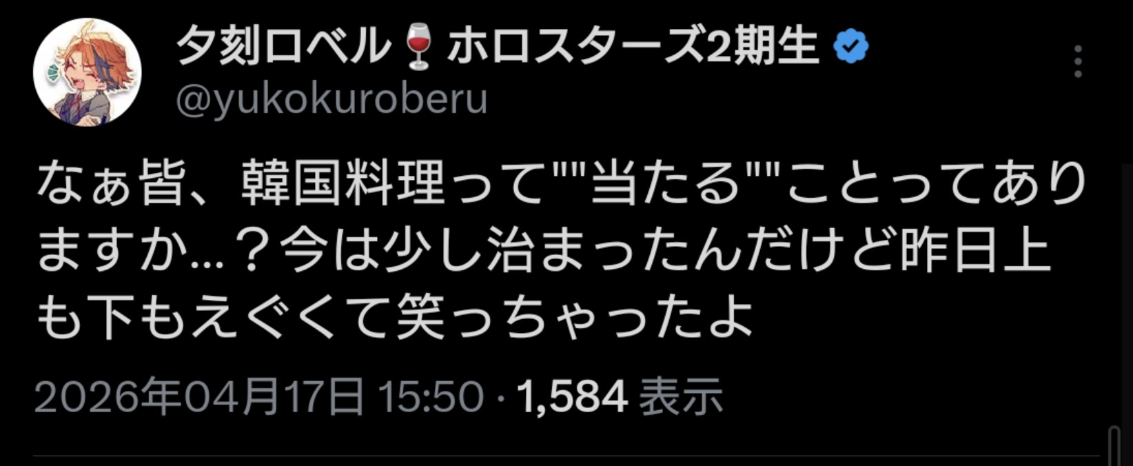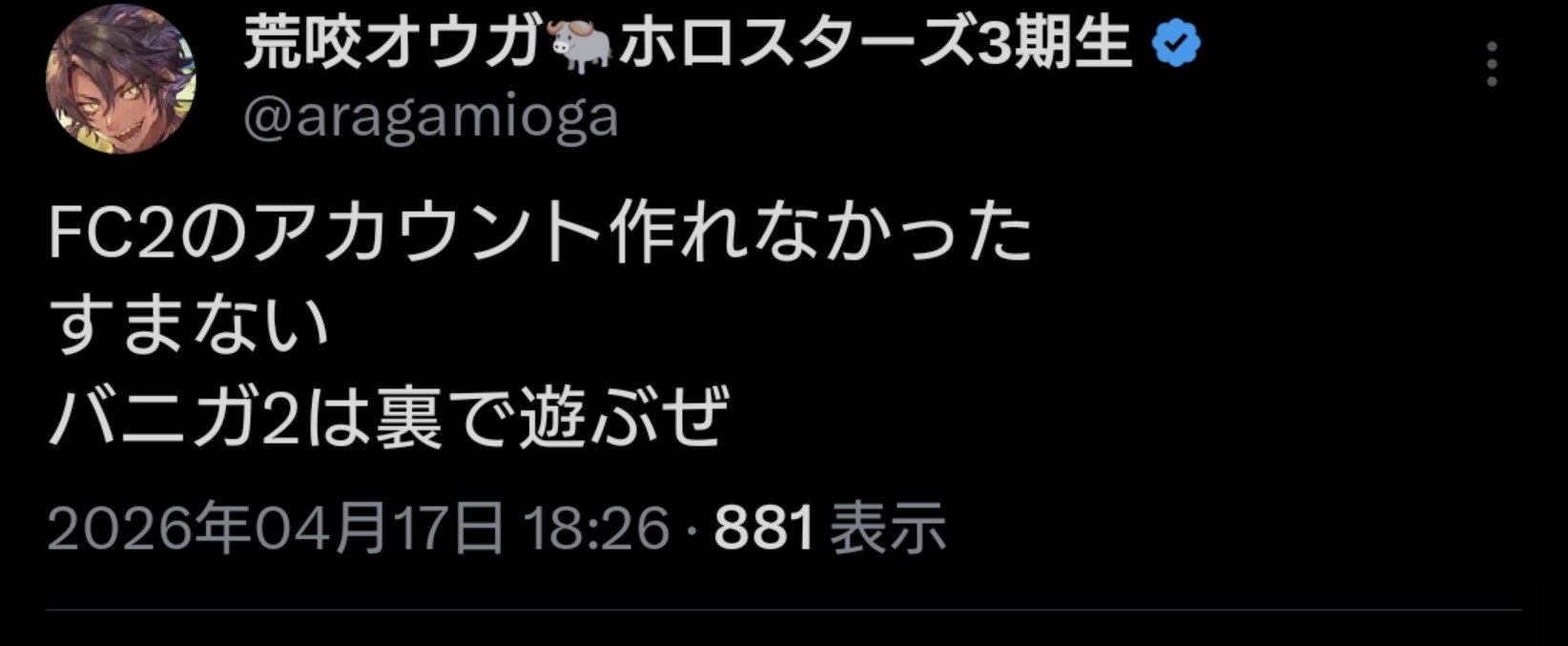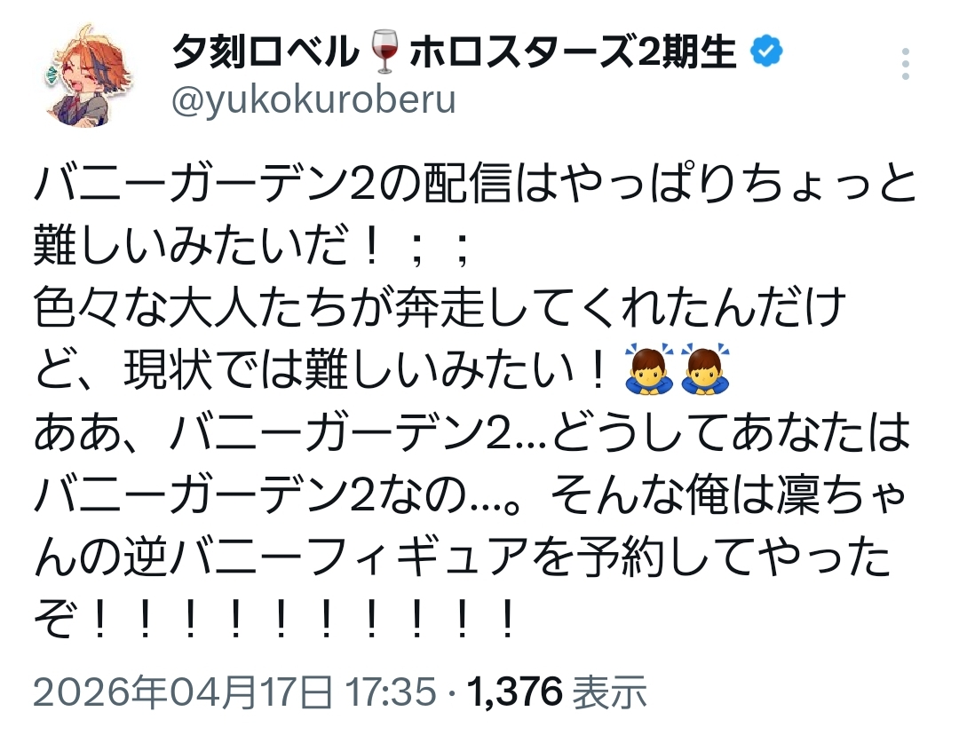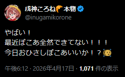 | … | 925無題Name名無し 26/04/17(金)20:20:29 IP:14.8.*(enabler.ne.jp)No.11880929+ホロライブに安全圏はないんや…! |