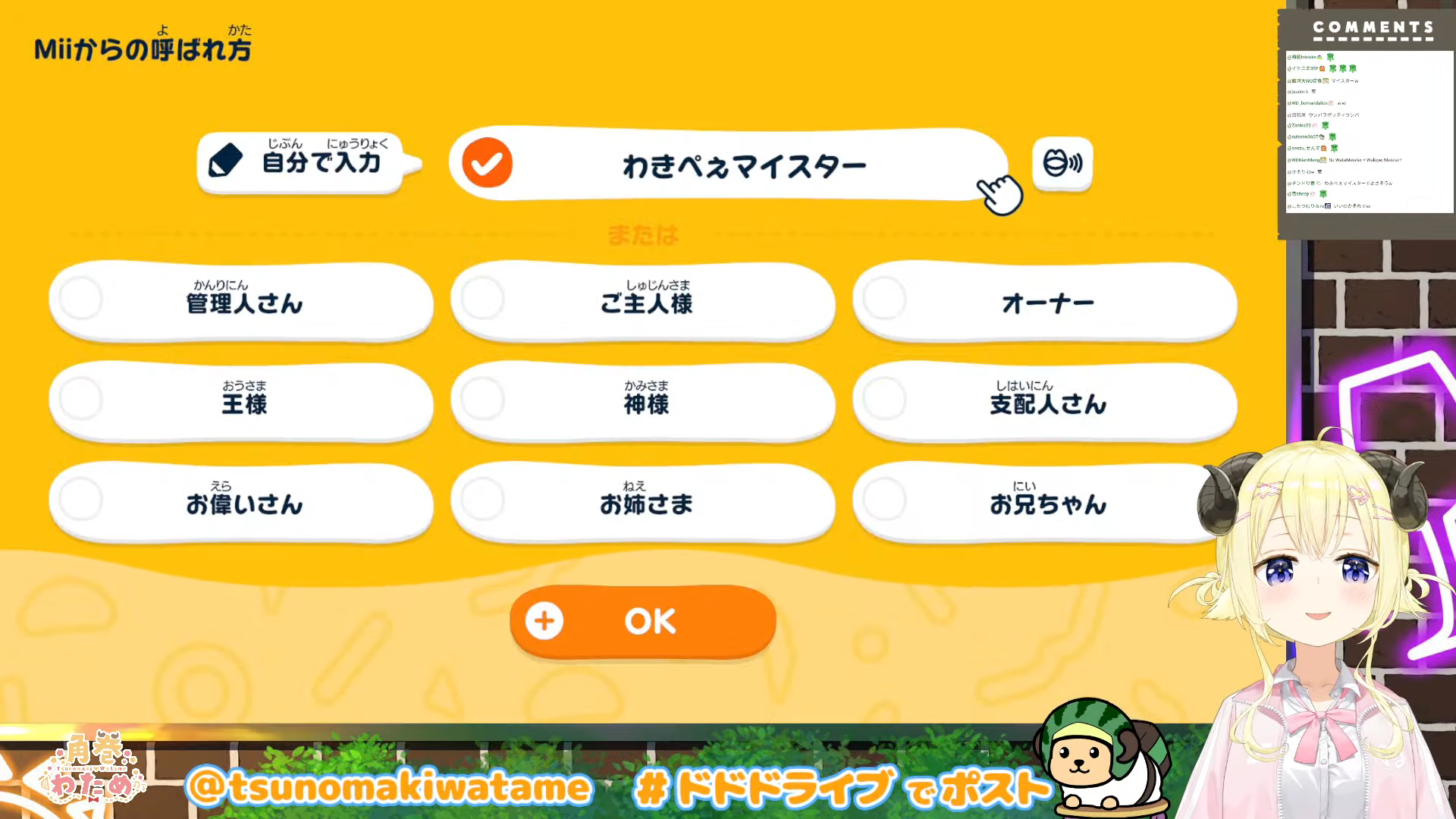 | … | 82無題Name名無し 26/04/24(金)01:39:50 IP:114.158.*(ocn.ne.jp)No.11910884+すごくわためって感じのMiiだ… |
