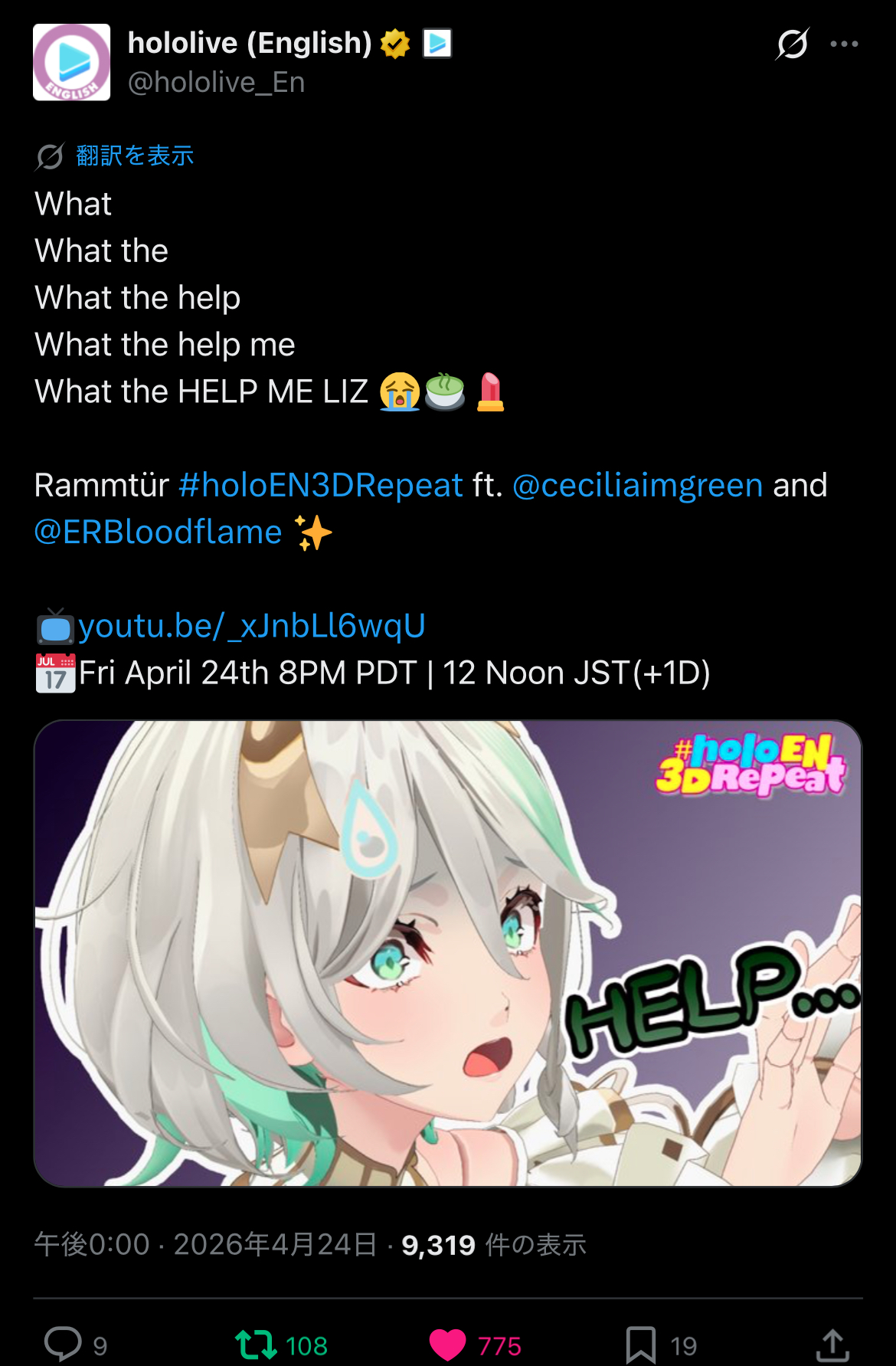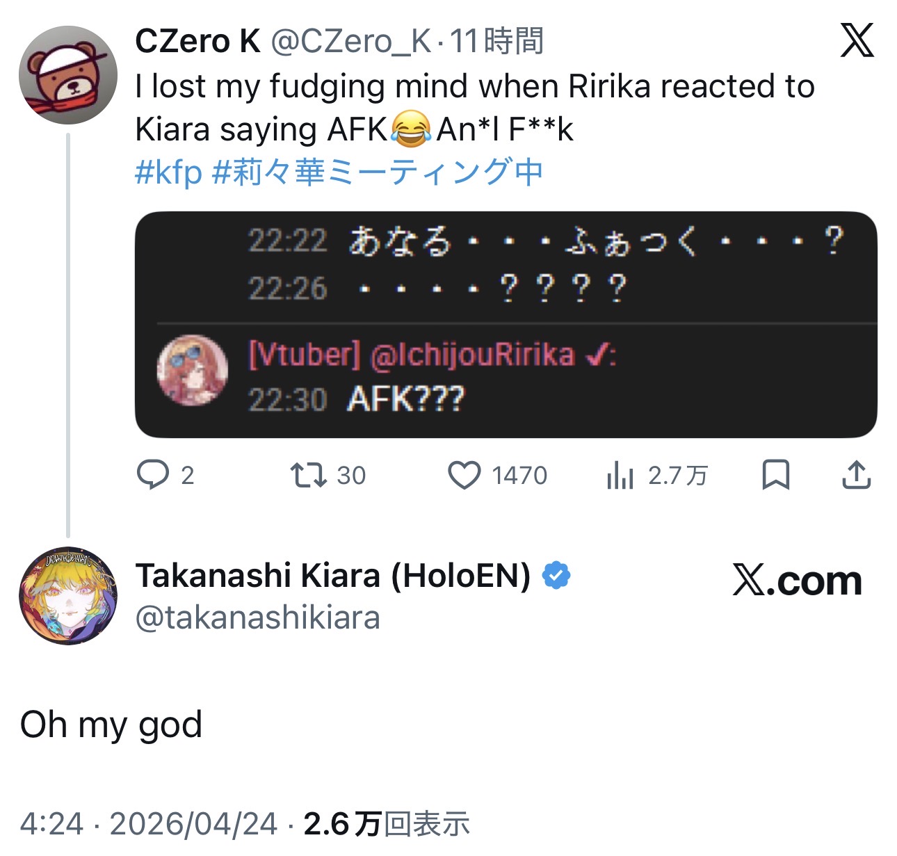 | … | 934無題Name名無し 26/04/24(金)19:58:27 IP:125.197.*(mesh.ad.jp)No.11911932そうだねx2>なぜホロメンはあれだけカキに当たっているのにまだ食べようとするのか |