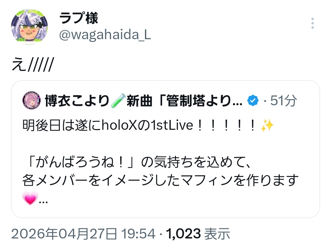 | … | 43無題Name名無し 26/04/27(月)19:19:01 IP:153.246.*(ocn.ne.jp)No.11927939+こよちゃんもう疲労です |