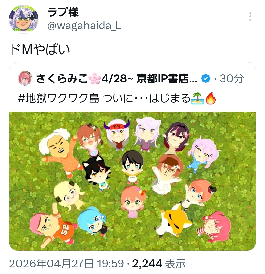 | … | 973無題Name名無し 26/04/27(月)20:23:35 IP:119.228.*(eonet.ne.jp)No.11928901+男がホロメンの島に!! |
