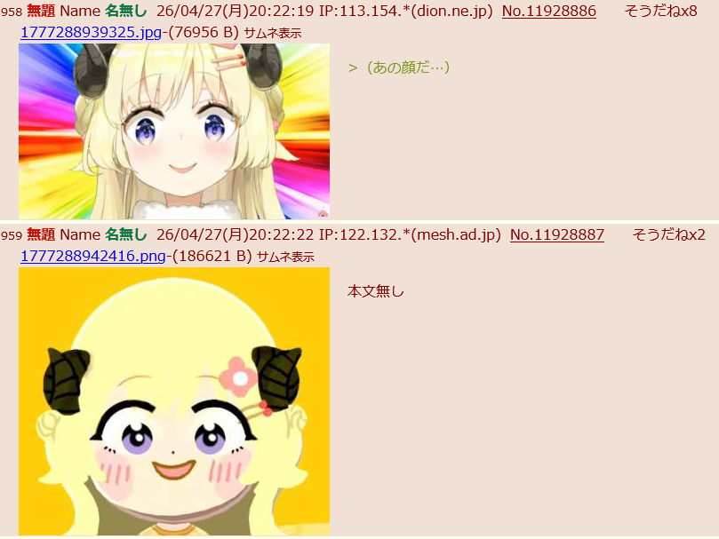 | … | 921無題Name名無し 26/04/27(月)20:20:24 IP:113.147.*(dion.ne.jp)No.11928847+実質アミバ |