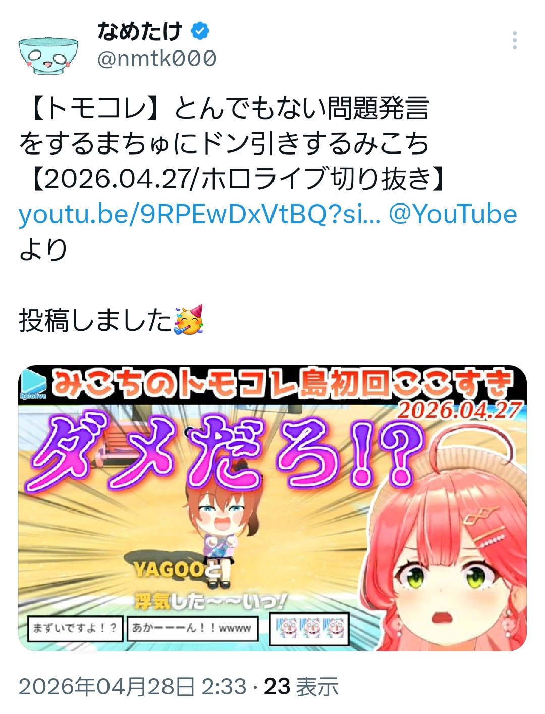 | … | 986無題Name名無し 26/04/28(火)21:04:36 IP:106.72.*(enabler.ne.jp)No.11932230+みこちのトモコレはワードセンスが古賀亮一先生のネタっぽいな |