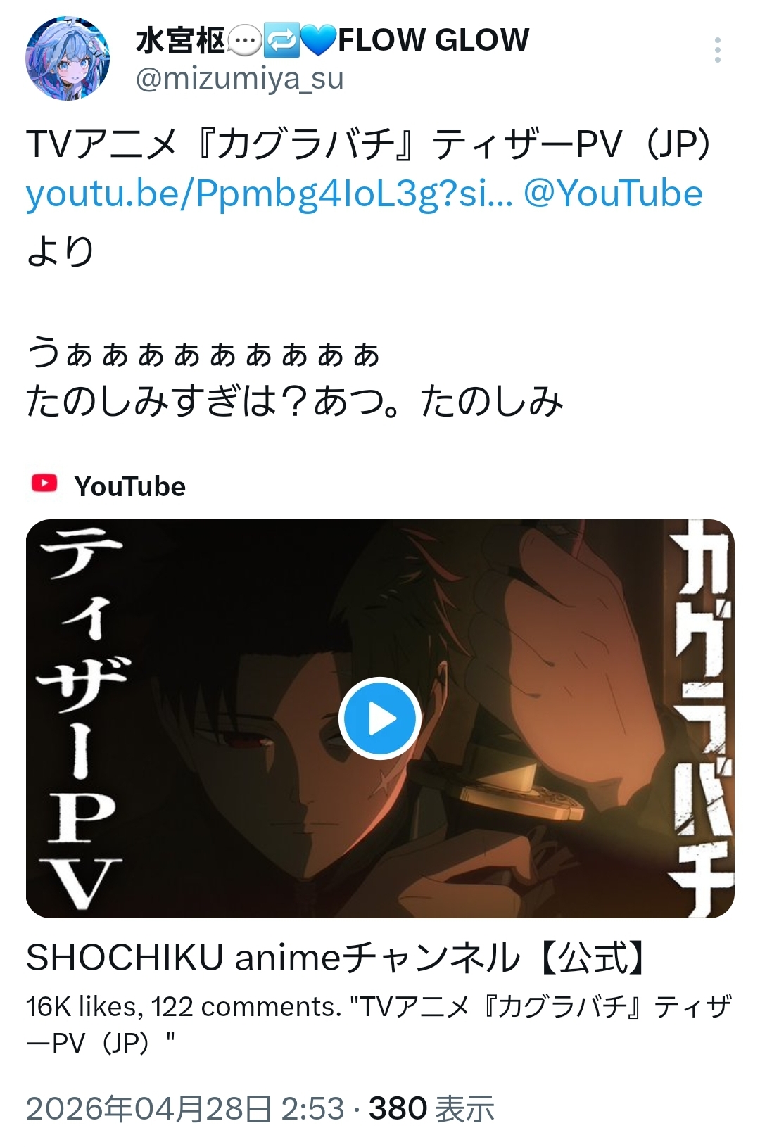 | … | 16無題Name名無し 26/04/28(火)01:08:10 IP:121.81.*(eonet.ne.jp)No.11931041+ダンスの話になると水宮さんになるな |