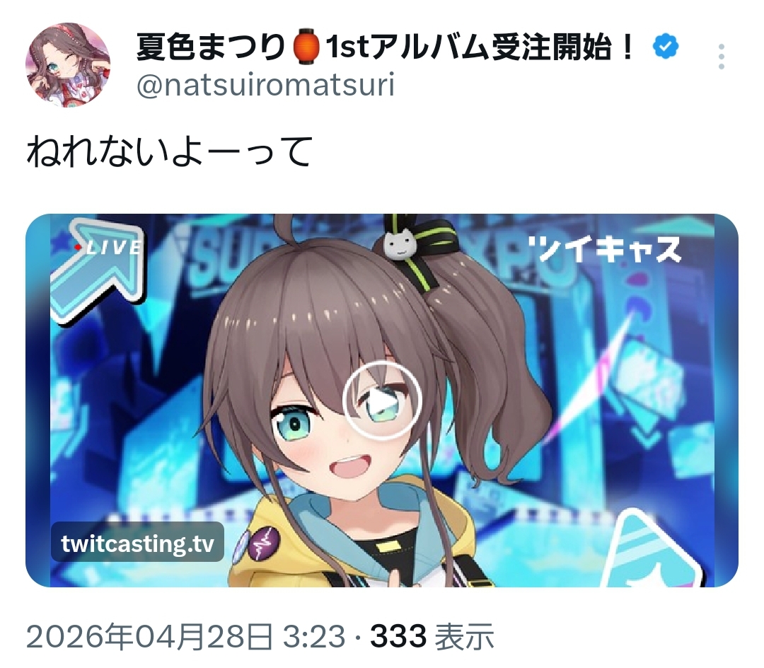 | … | 55無題Name名無し 26/04/28(火)03:25:38 IP:49.129.*(mesh.ad.jp)No.11931093そうだねx1 1777314338964.jpg-(480863 B) まちゅのツイキャスよー |