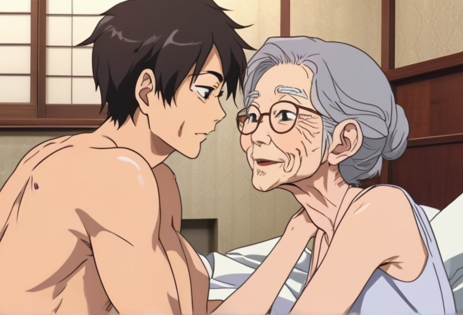 「美人な熟女かホテルのベットで若い男の亀頭を観て触る」というプロンプトにしたら、亀さんが、出てきてしまいました。