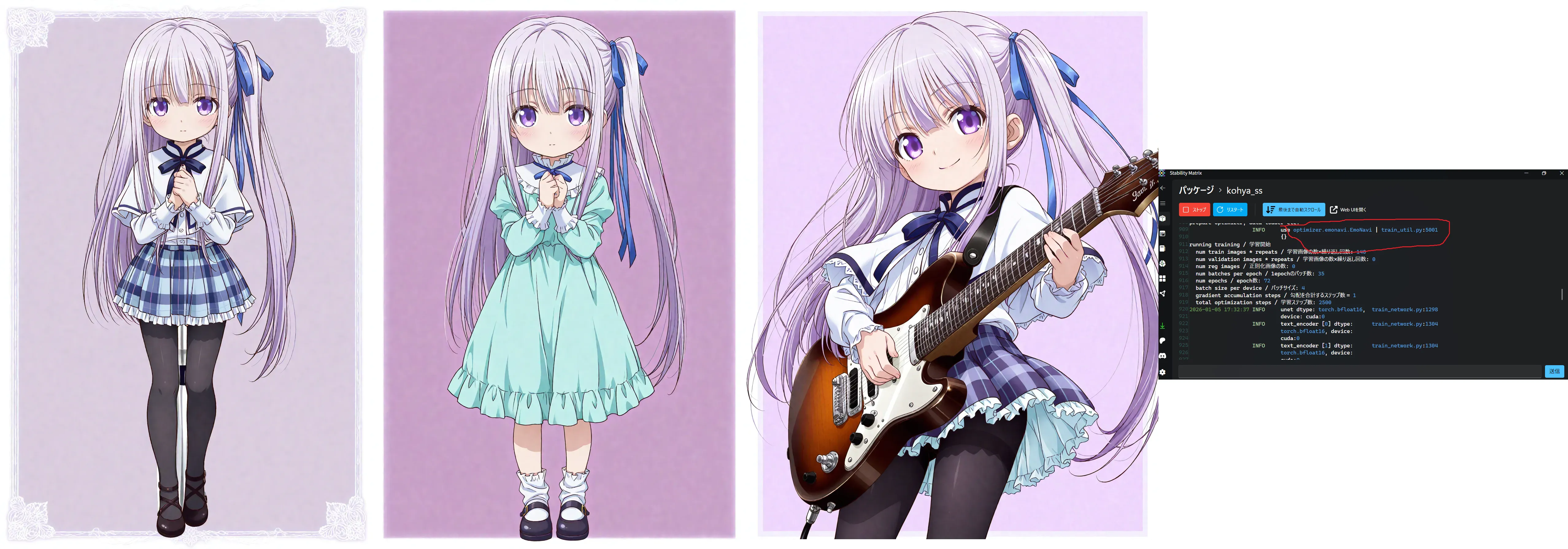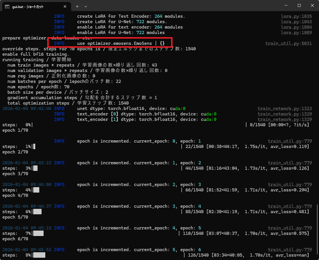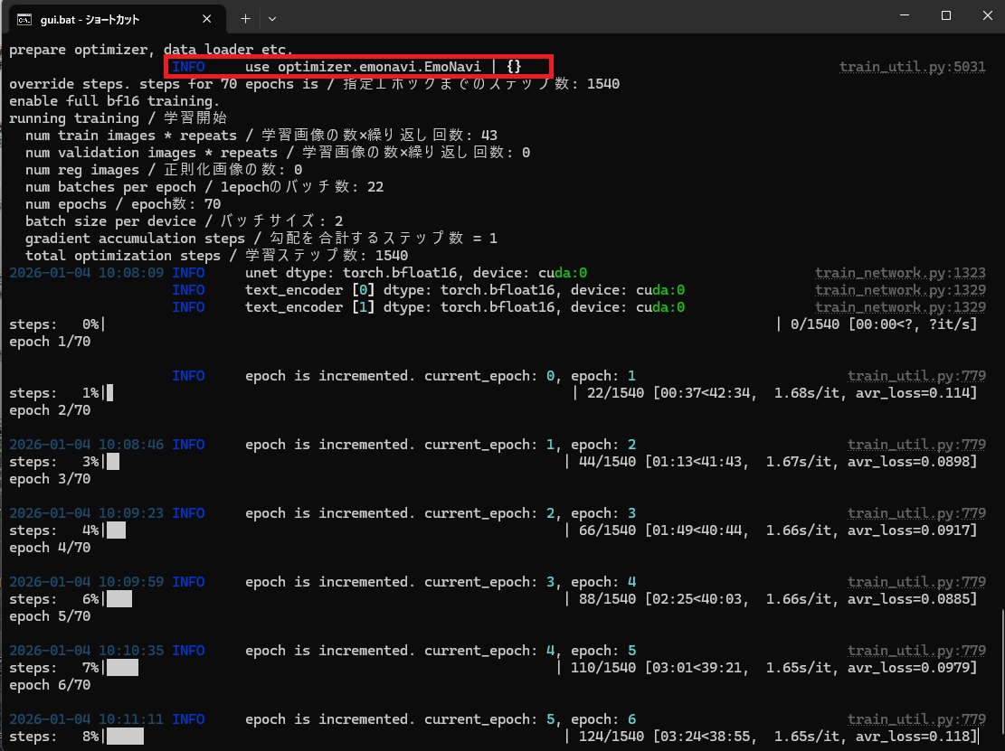 | … | 347無題Name名無し 26/01/13(火)00:32:12 ID:0G15vXlcNo.153062そうだねx1Kohya_SS(GUI)でoptimizer.emonavi.EmoNaviは通るけどoptimizer.emonavi.EmoFactとoptimizer.emonavi.EmoLynxはエラーで実行されないね |