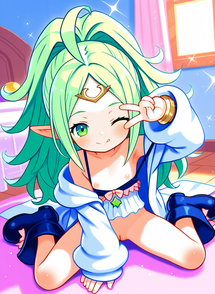 | … | 221無題Name名無し 26/01/10(土)23:28:51No.152827そうだねx2 1768055331719.png-(1084775 B) Beautiful art,Solo,pastel color , oppai loli , ultra big hair ,art by harada takehito, puyopuyo , indoors, child room , big wrist ornament, twinkle stars , one eye closed , half closed eye , starry inside wear , oversized long white jacket , smile , nipples, pussy line , jacket front open, messy hair, oversized huge long boots,white boots, armpit , standing, spread legs , v over eye,lick lips , pussy line, camisole lift , arle nadja , gradation hair,pigeon-toed, |