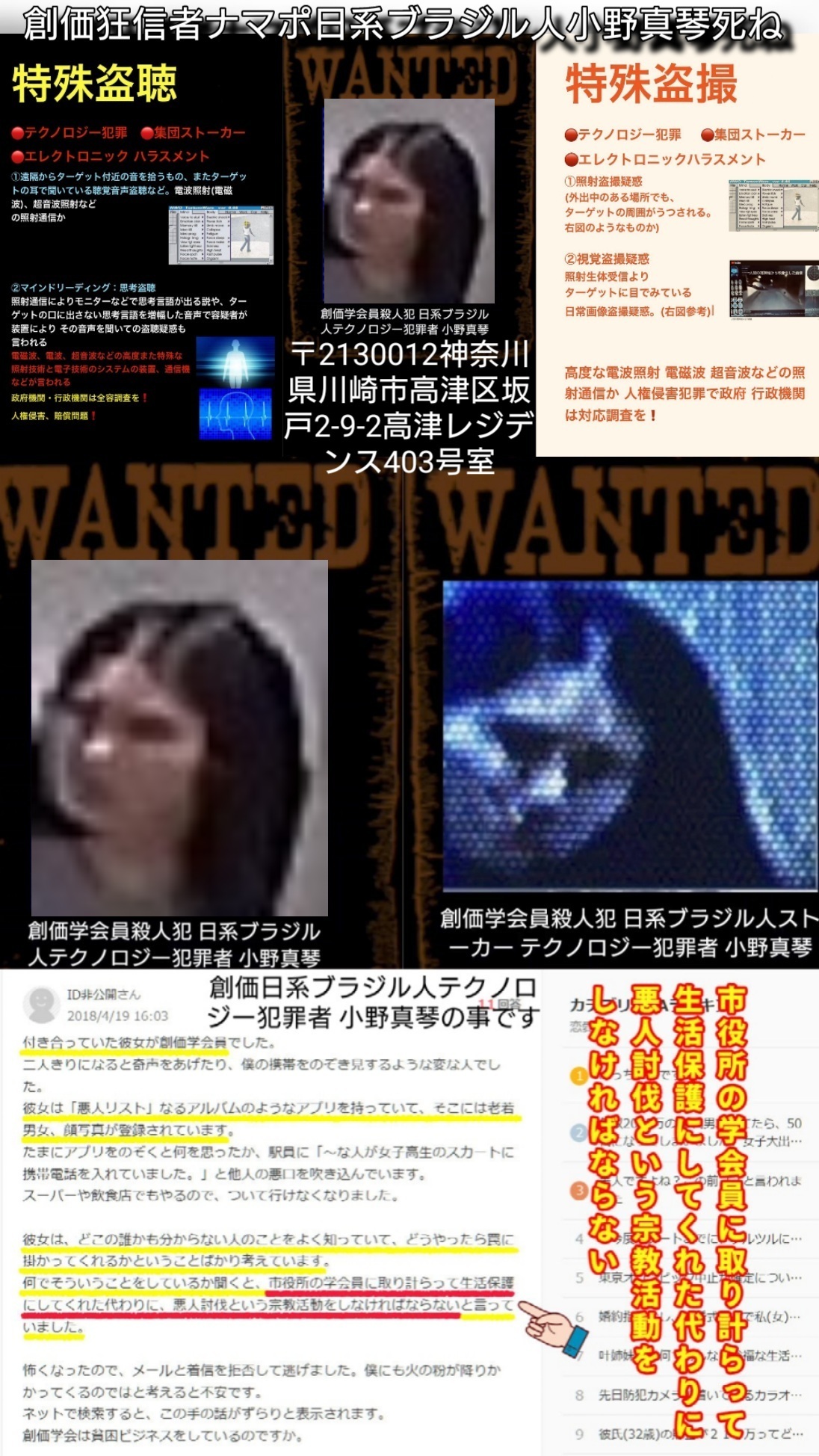 | D | fu6517331.jpg | テクノロジー犯罪者兼ストーカー殺人犯小野真琴らの周知活動をしています。 日系ブラジル人イスラム教徒、テクノロジー犯罪者兼ストーカーの小野真琴(〒213-0012神奈川県川崎市高津区坂戸2‐9‐2高津レジデンス403号室)とアスンサオファビオ、 田石(〒2130012エクセレンスハイム102号室)はNWO Tortureware 6.66という極悪加害ソフトと特殊な機械、指向性スピーカーなどを使用しターゲットをストーキング、加害し続けています。 このソフトの項目に載っている事をすべて被害に遭っています。小野真琴とアスンサオファビオに騒音トラブルの延長でこのソフトで加害されるようになりました。 隣のエクセレンスハイム102号室に住む田石も含むこの3人の犯罪メンバーにこのソフトで毎日拷問、加害をもう3年以上もされています。 2025年3月に止めてくれとお願いしに行ったのですが、小野真琴に「絶対に止めねぇからなぁ!」と怒鳴られました。(明らかに自白) 「NWO Tortureware 6.66」は、マインドコントロールと監視に関連しています。このソフトウェアは、標的の個人を管理するためのツールとして悪用されており、 「Voice to Skull」(V2K)技術や遠隔神経モニタリングなどの機能を備えています。非接触で個人の神経活動を操作・モニタリングでき、集団ストーキングに使用されています。 このソフトの項目を見てください。 ターゲットの視覚や聴覚から電気信号を読み取って盗聴盗撮できます。 盗聴器やカメラを使わずして盗聴盗撮ストーキングができてしまいます。 https://imgur.com/a/Lzsd3n4 https://archive.org/details/nwo-tortureware https://kopipe.net/up/4Q3 https://imgur.com/a/lGoTiqS 極悪ソフトを使っての盗聴盗撮の様子がこちらの動画です。 https://imgur.com/a/mq2Ju1d 小野真琴らテクノロジー犯罪者兼ストーカー殺人犯の出現場所は特にマルエツ坂戸インター店とドン・キホーテ溝の口店、ファミリーマート坂戸店、セブンイレブン坂戸店です。 溝の口を拠点に活動しているトクリュウのメンバーです。 溝の口近辺に住んでいる方は特にご注意ください。 | 194 | 26/04/07(火)00:54 |