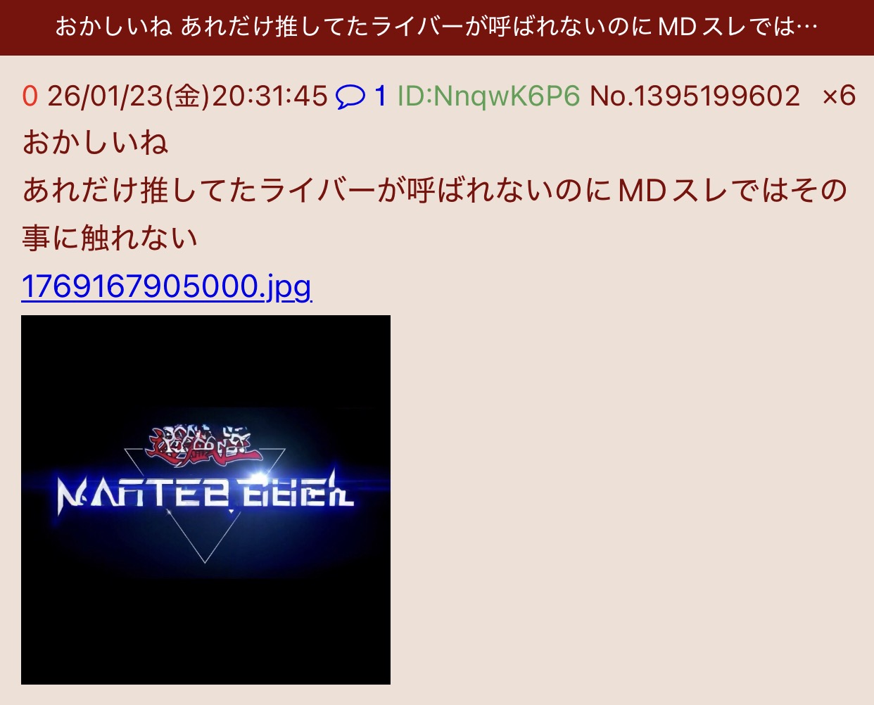 | D | fu6196711.jpg | aa5fa67091637b0a5d357b67936b99e7 | 64 | 26/01/21(水)23:58 |