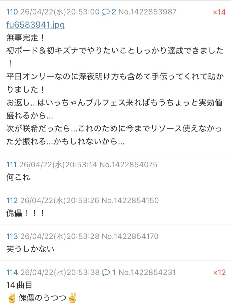| D | fu6578231.jpeg | F1E23307-9DB1-4EA0-B63C-0A4227C8AAA8 | 122 | 26/04/21(火)17:56 |